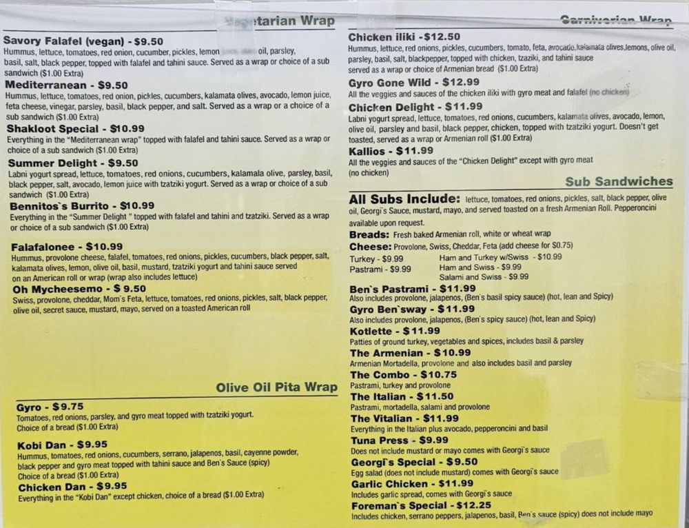 Labneh yogurt spread, lettuce, tomatoes, red onions, cucumbers, Kalamata olive, parsley, basil, black pepper, salt, avocado, and lemon juice with tzatziki yogurt. Served as a wrap or choice of a sub sandwich for an additional charge.